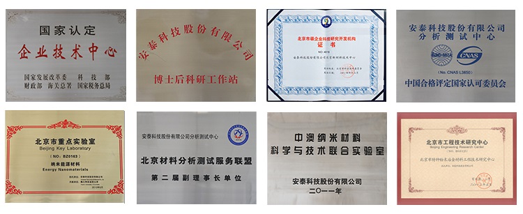 国家认定企业技术中心 企业博士后科研流动站 北京科技研究开发机构 中关村先进功能材料技术支撑平台 中国材料研究学会磁性材料及应用专业委员会主任委员单位 中国钢结构协会粉末冶金分会硬面技术专业委员会主任委员单位 国家实验室认可(CNAS)资质